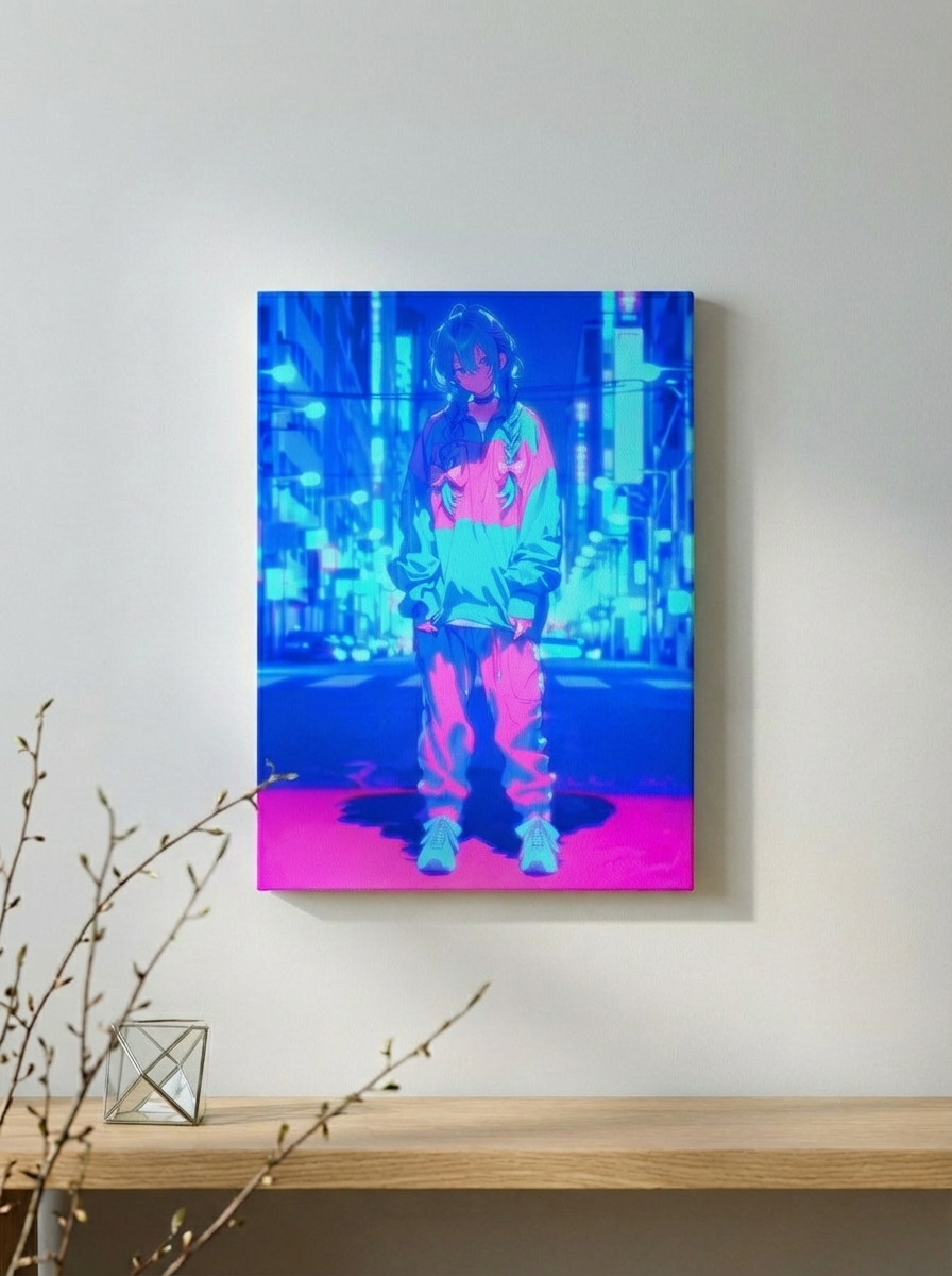 無重力のような静けさの中に立つ一人の探究者。 その姿は、未知と対話し続ける人間の象徴です。 無機質な線の重なりの中に、どこか温もりを感じる構成。 モダンなリビングや書斎にも、静かな緊張感と洗練を添えるアートです。