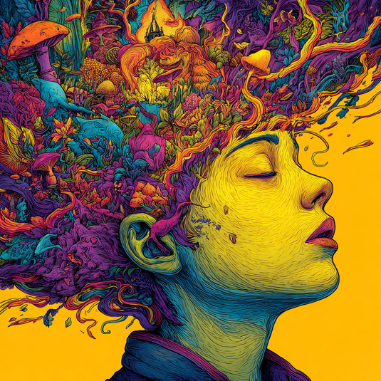 閉じた瞳の奥から、感情、記憶、幻覚、そしてまだ言葉にならないイメージの奔流があふれ出す——それらは鮮やかな補色と流動的な筆致によって、見る者の心に直接語りかけてくる。