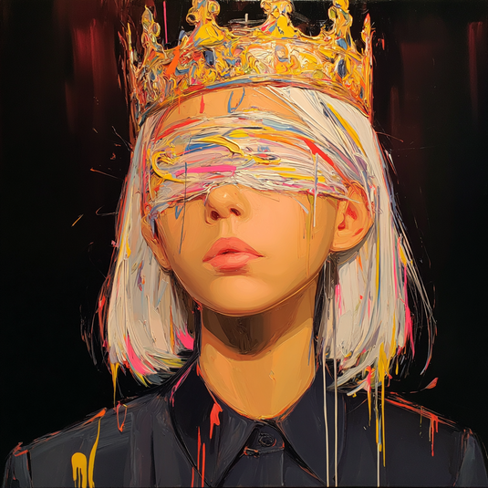 キャンバスに描かれるのは、成功の物語ではなく、痛みや孤独を抱きながらもなお進もうとする“成り上がりの衝動”。にじむペイント、塗りつぶされた目元、金の王冠——それらは全て、上昇への欲望と過去の傷を昇華したシンボルです。ASc3ndの作品は、ただの勝者の姿ではなく、「敗北と再生をくり返してきた者にしか描けない王者の肖像」として迫ってきます。