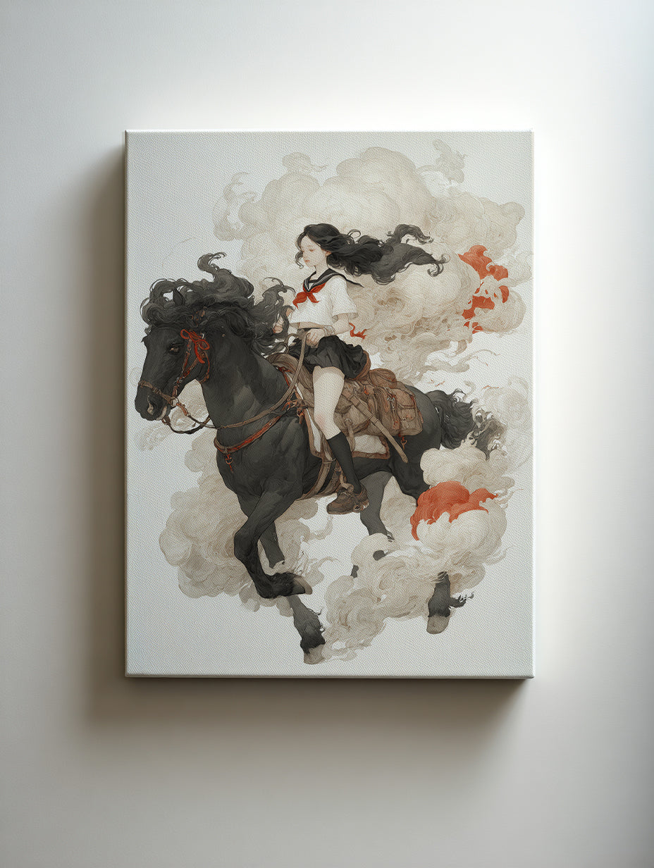 淡くけむるような白煙と、深みのある黒馬のコントラストが印象的で、静寂の中に確かな躍動を感じさせます。少女の静かなまなざしと風の流れがやわらかく交わり、時間がふっと緩むような穏やかなムードに包まれています。赤の差し色がほんのりと温度を添え、物語の余韻をそっと残していきます。