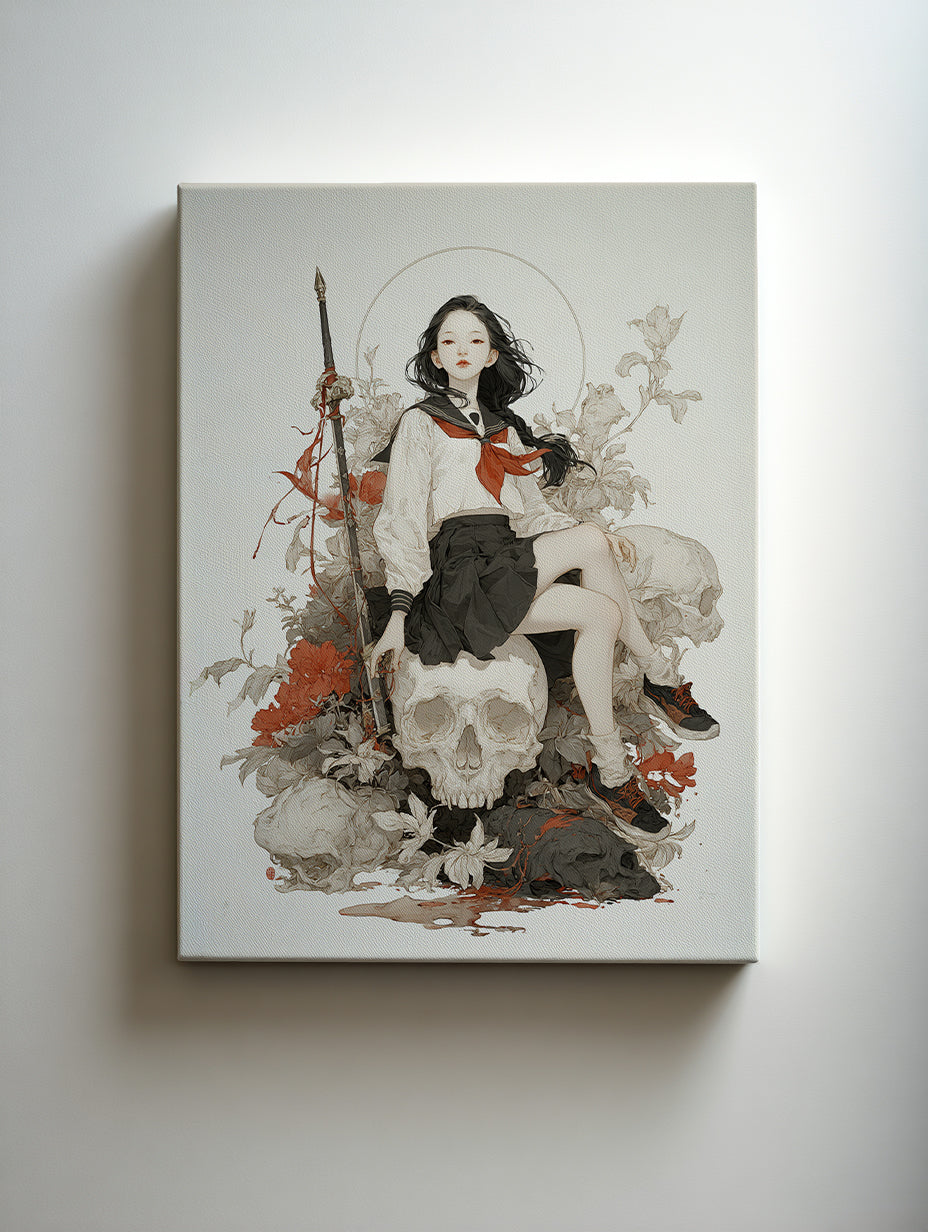 - 現実と幻想の境界で「美と死の共存」を描くアーティスト。 彼の作品には、終焉の中に咲く花、静かに武器を握る少女、 そして儚さの奥に潜む生命の力が繰り返し登場する。 色彩は控えめでありながら、血や花など象徴的な赤を効果的に用い、 無音の中に息づく「衝動」を描き出す。 天海凛の世界は、死を拒絶せず、 それを通してしか見えない「再生の美しさ」を語る。