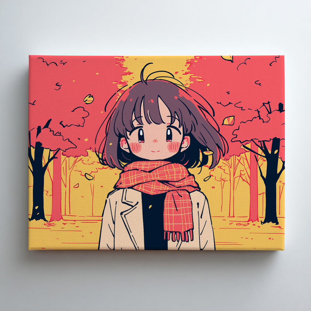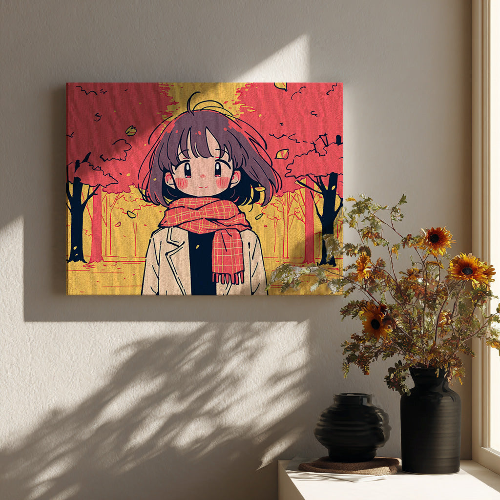 鮮やかな紅葉に包まれた秋の並木道を背景に、笑顔の少女が佇む一枚。