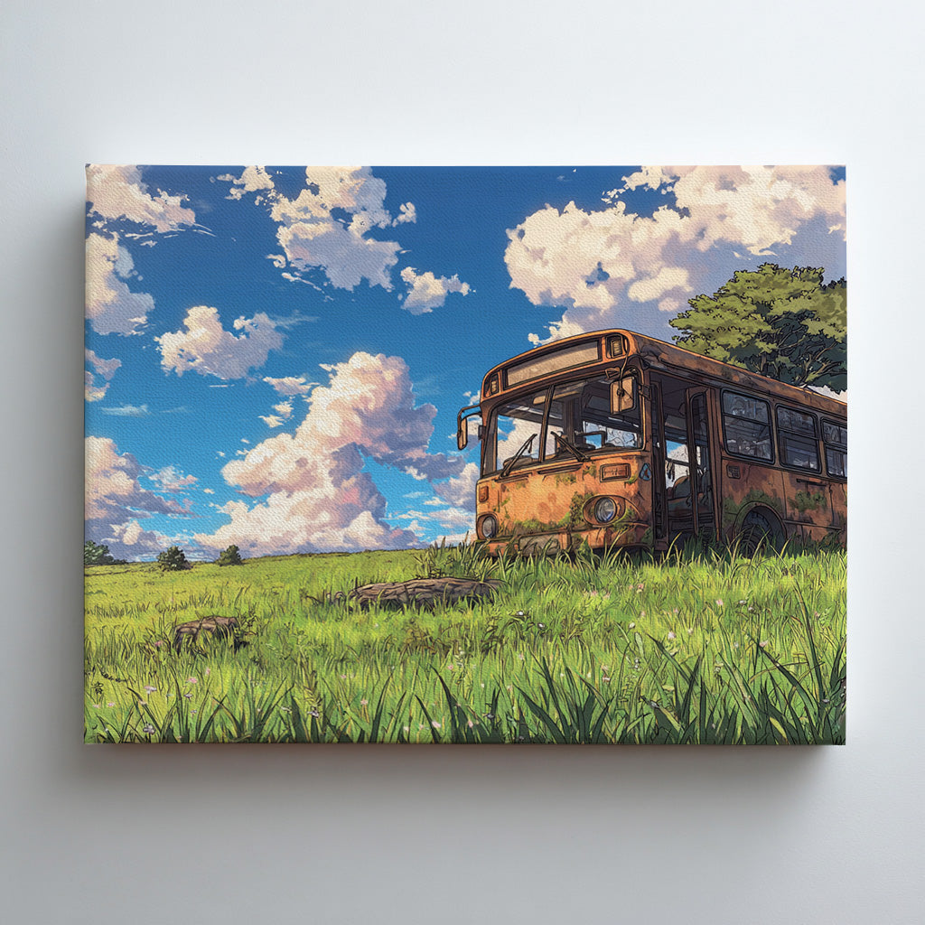 時が止まったような草原に、静かに佇む一台の廃バス。