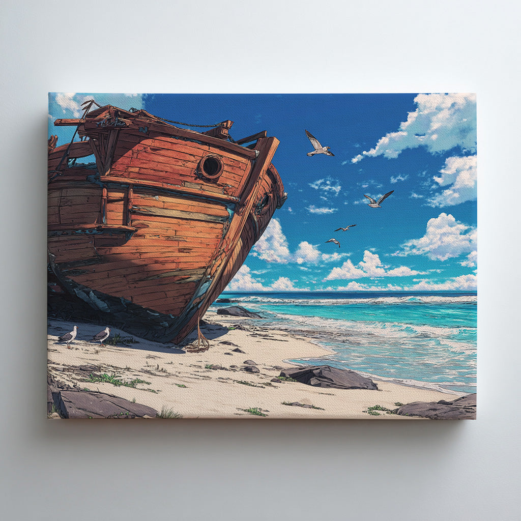 波が静かに寄せる砂浜に、打ち捨てられた一隻の木造船。