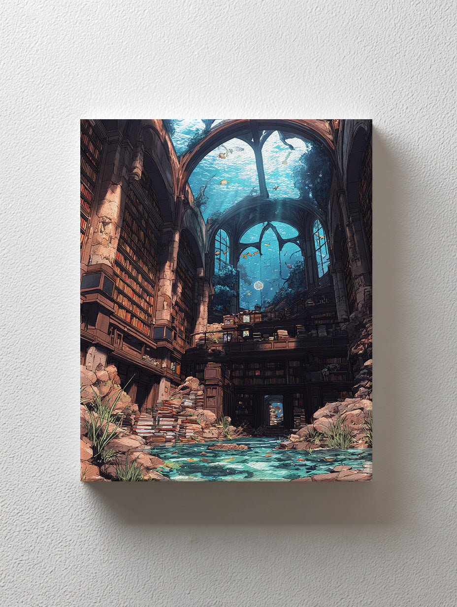 かつて知の宝庫として栄えた大図書館は、今や水に満たされ、静けさの中に沈んでいます。