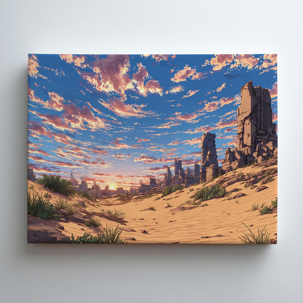 崩れかけた高層建築と、風に揺れる砂と草が織りなす光景は、文明の終焉と自然の浸食が交差する“終わりの美”を描いています。