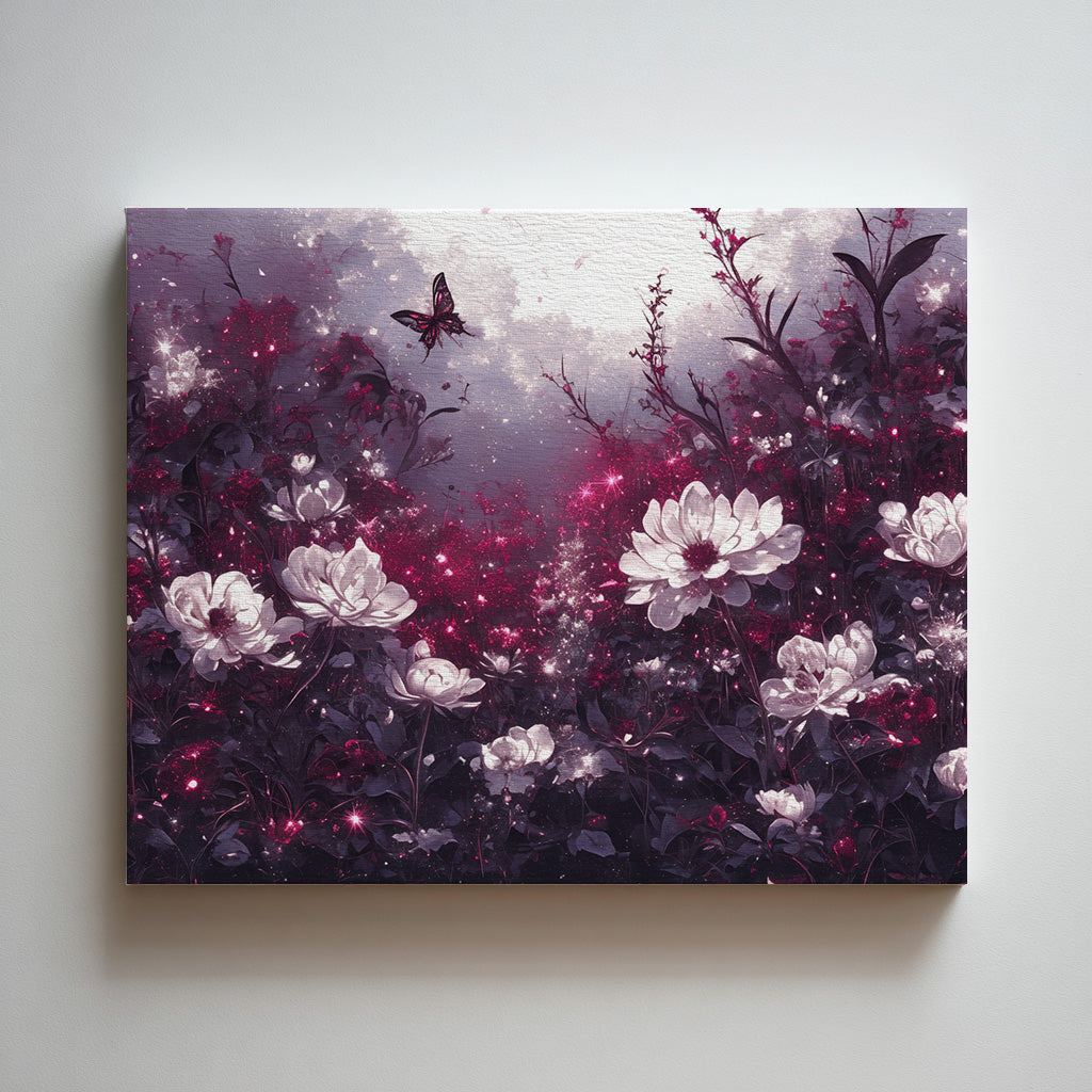 かすかな光を湛えた宵の空に、白く咲き誇る花々と、ひとひらの蝶が浮かび上がる幻想的な一枚。
