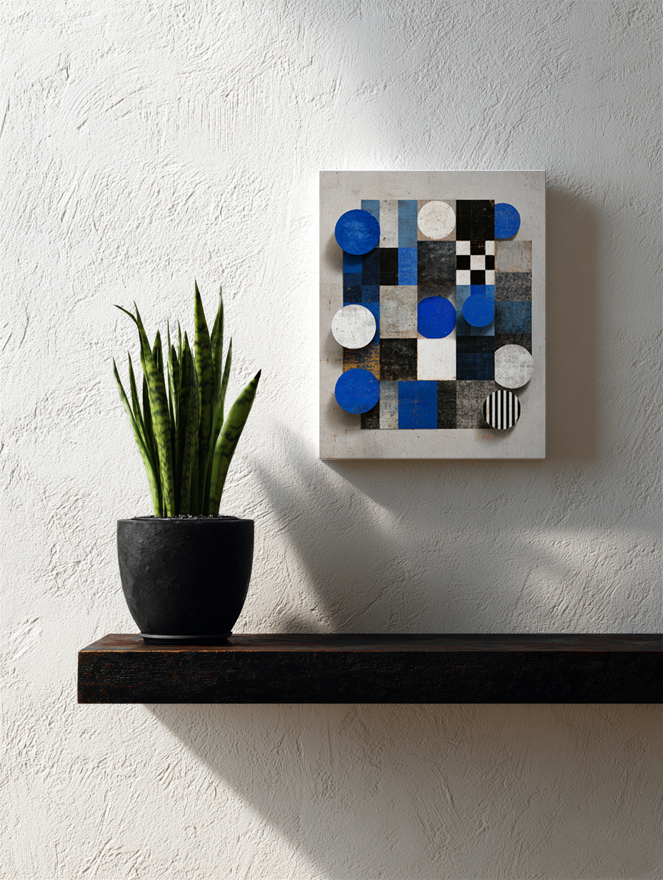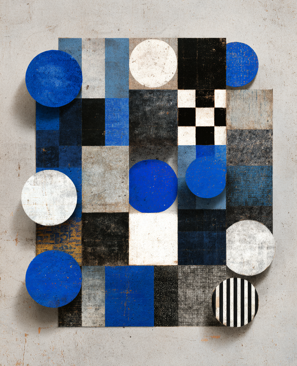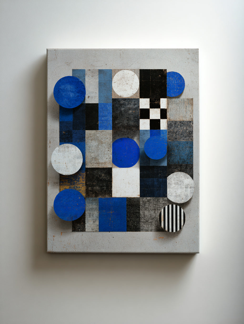 「記号の迷路」は、ブルーとモノトーンを基調とした幾何学構成の中に、円、格子、ストライプといった記号的モチーフが浮かび上がる作品です。
