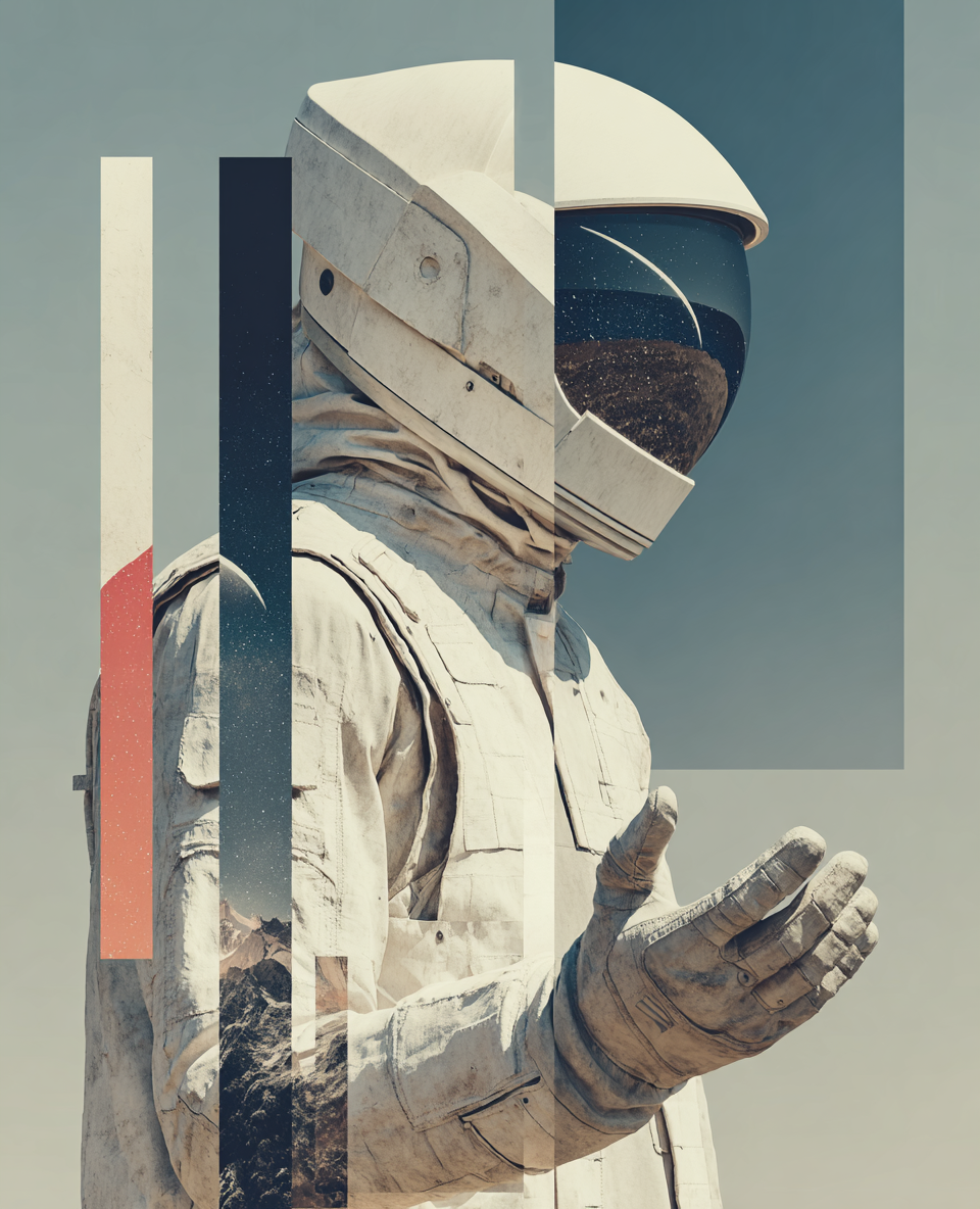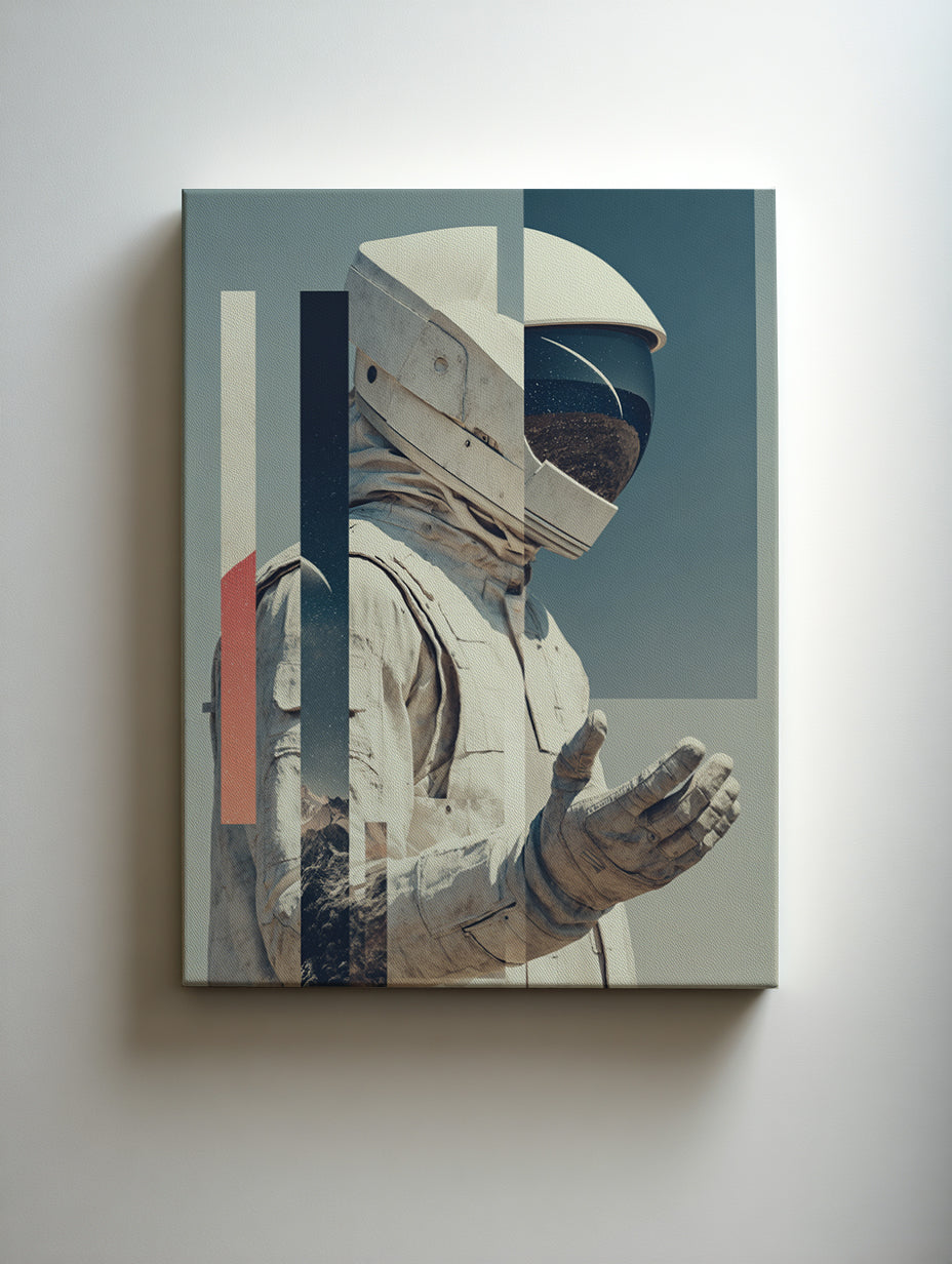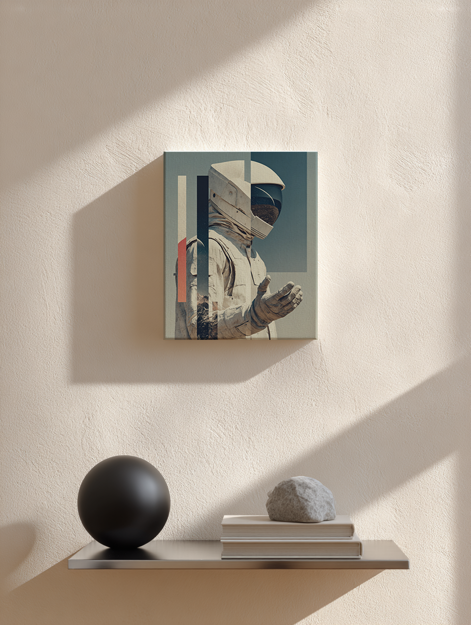 宇宙服に包まれた人物は「誰か」であると同時に「誰でもない」、抽象とリアリズムのあいだを漂う象徴として佇んでいます。