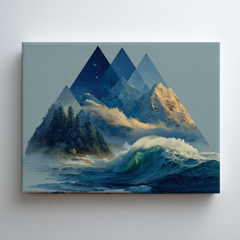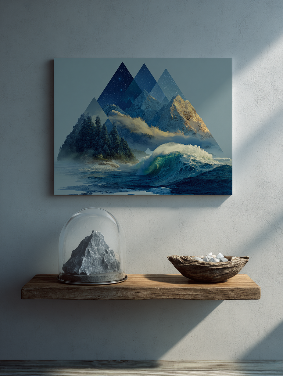 空、山、森、海——それぞれの風景が幾重にも重なり合い、ひとつの静かな世界を形づくるコンセプチュアルな作品です。
