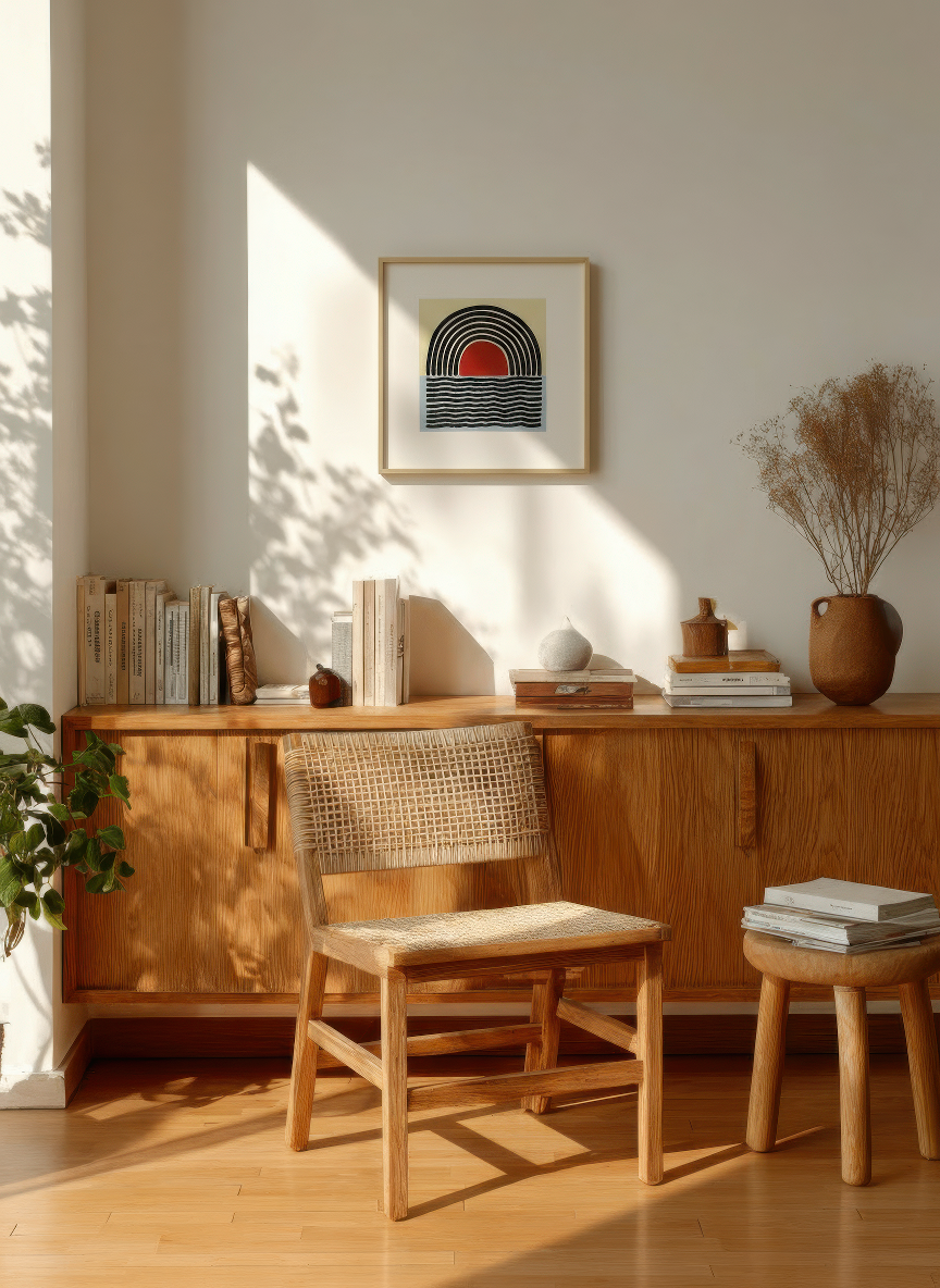リビングや玄関など、視線の集まりやすい場所に。北欧やナチュラルなインテリアとの相性も良く、空間の印象を整えるアクセントとして活躍します。アートがもたらす“静かな存在感”を楽しめる飾り方がおすすめです。