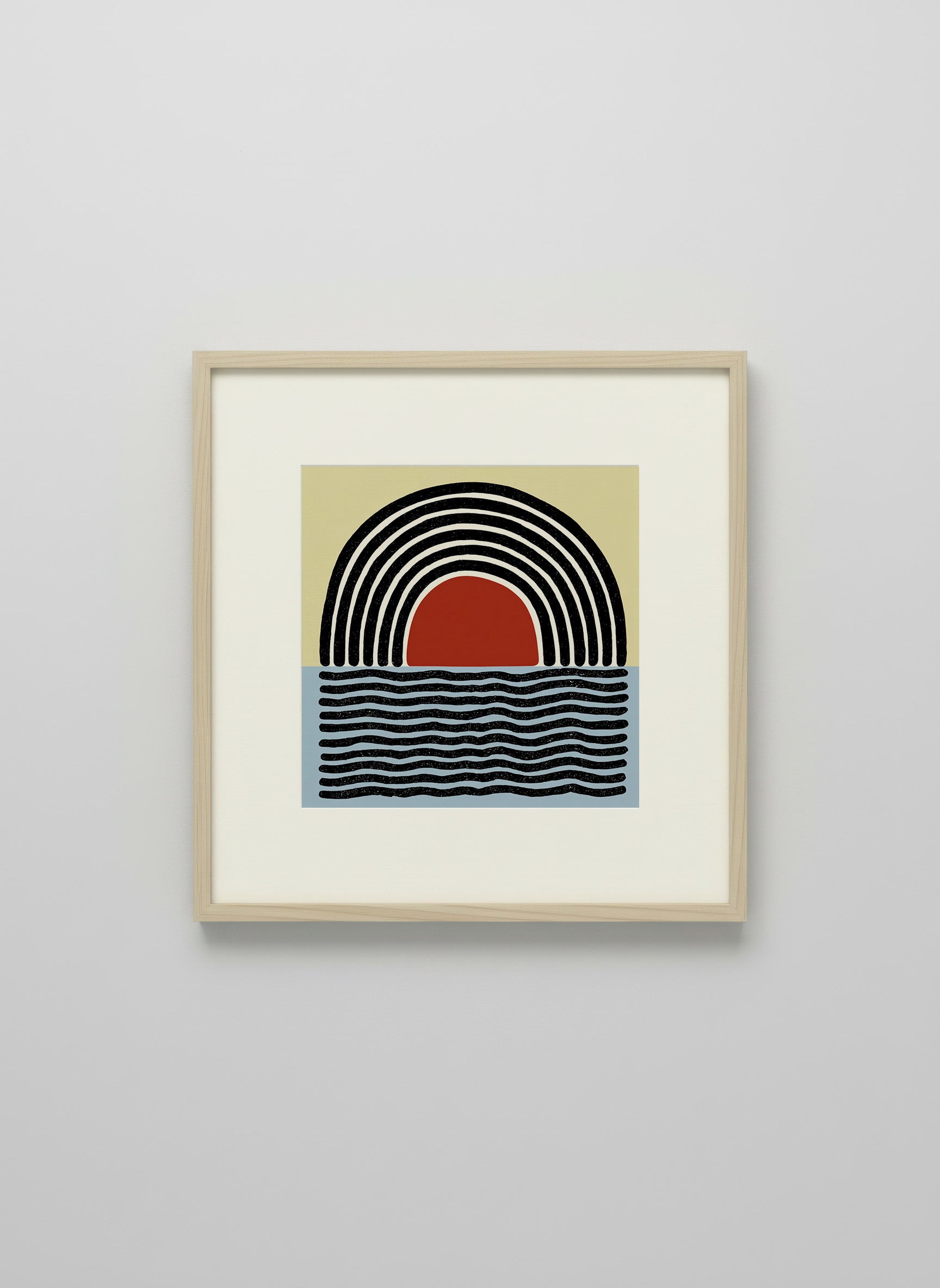 太陽が静かに浮かび上がる瞬間、空と水面がひとつに重なる。そんな自然の律動を抽象的に表現した一枚です。穏やかでリズミカルな曲線が空間に柔らかな余白をつくり、視線をふっと留めます。