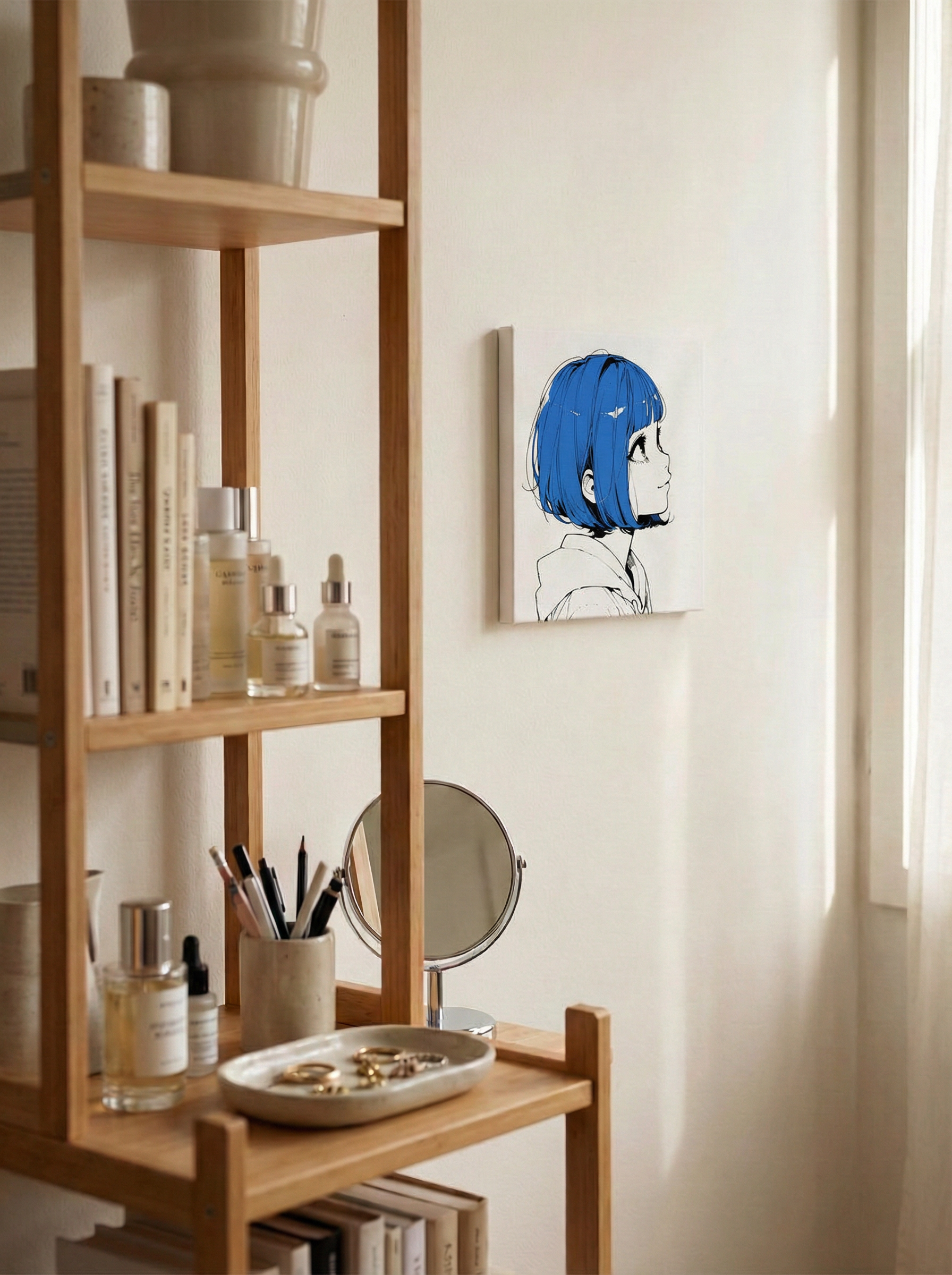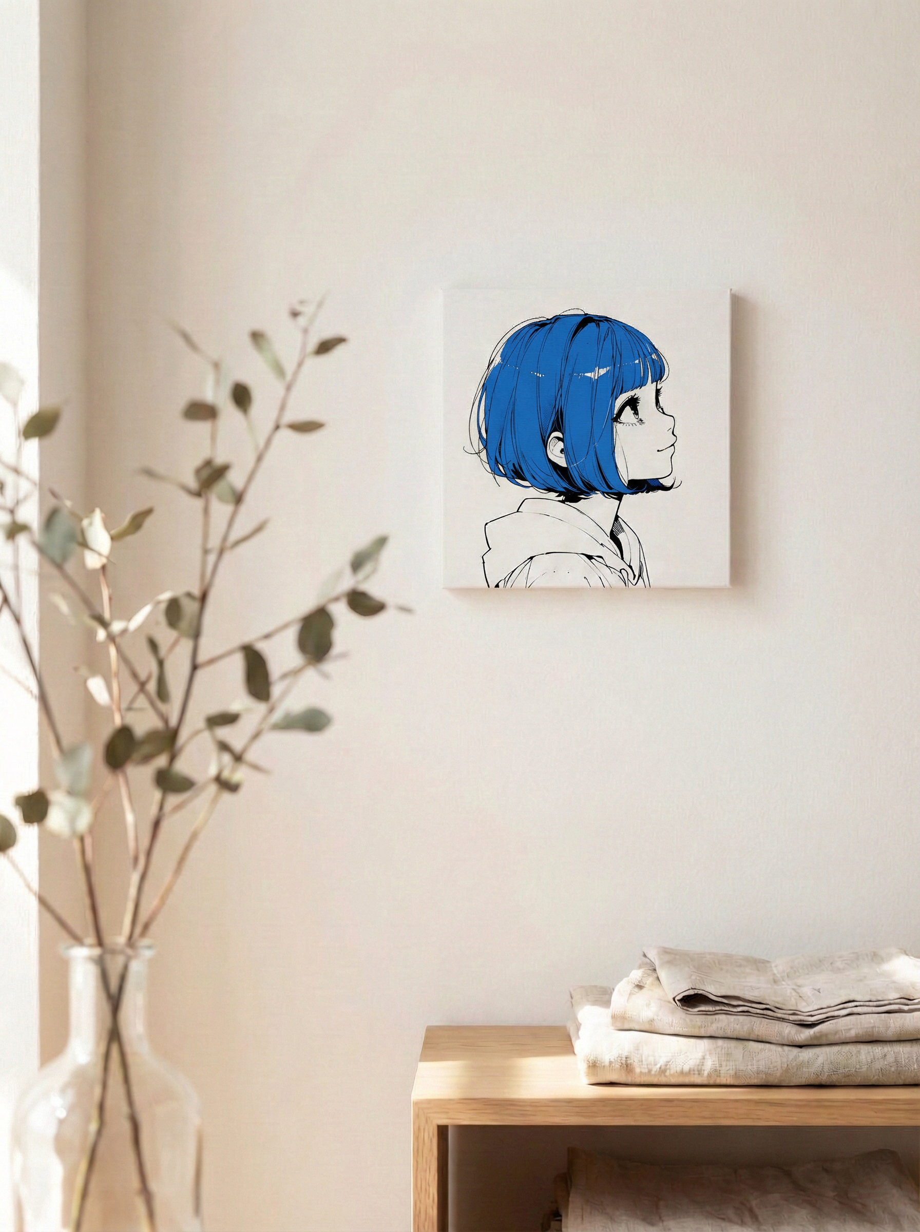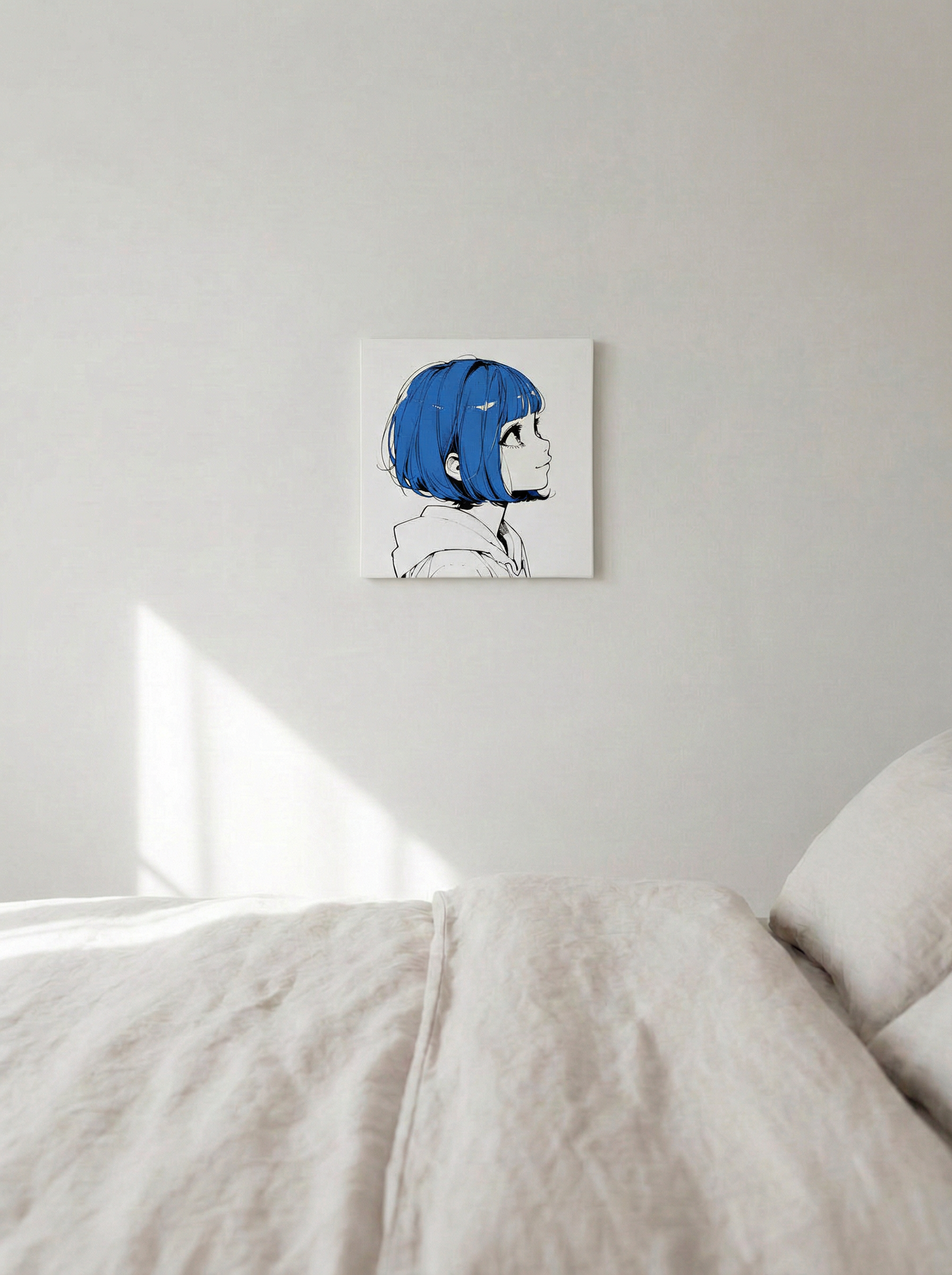 白壁のミニマルな空間や、北欧インテリアに合うやわらかな木家具のある部屋、整えられたデスク周りに特によくなじみます。シンプルな空間に飾ると、ブルーのアクセントがほどよい温度を添え、静かな中にも個性のある印象へと導いてくれます。主張しすぎず、それでいて視線を惹きつけるため、おしゃれな空間づくりに取り入れやすいアートです。