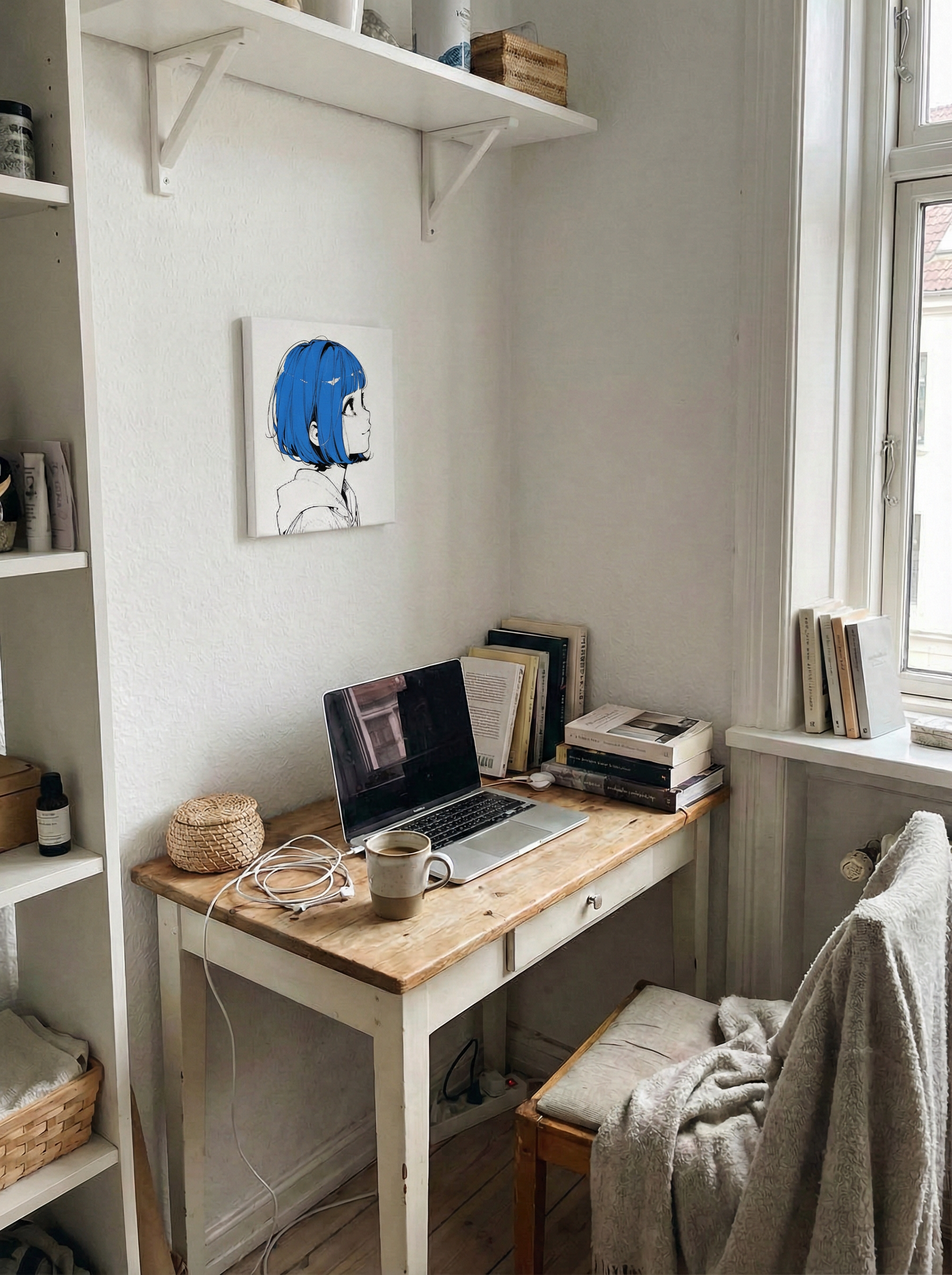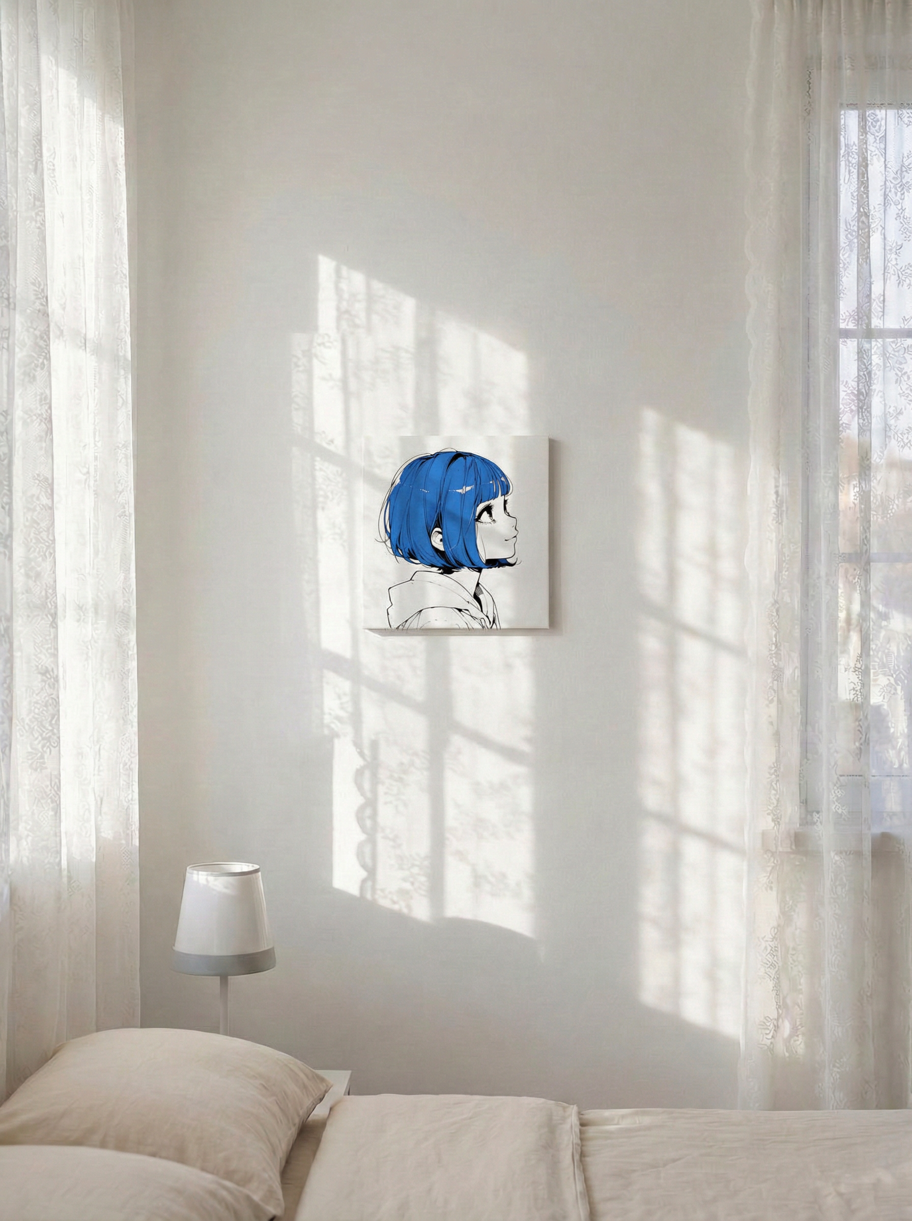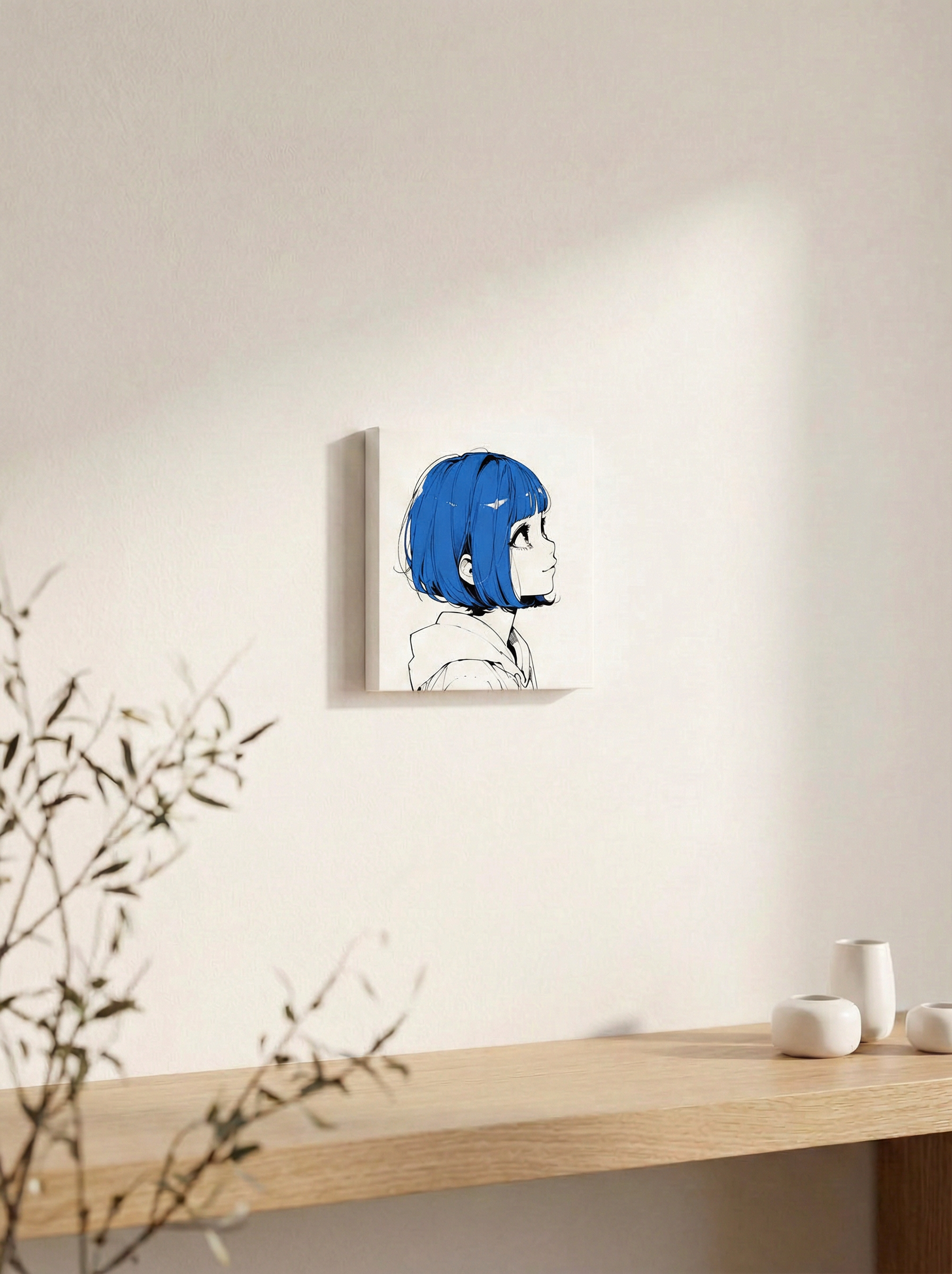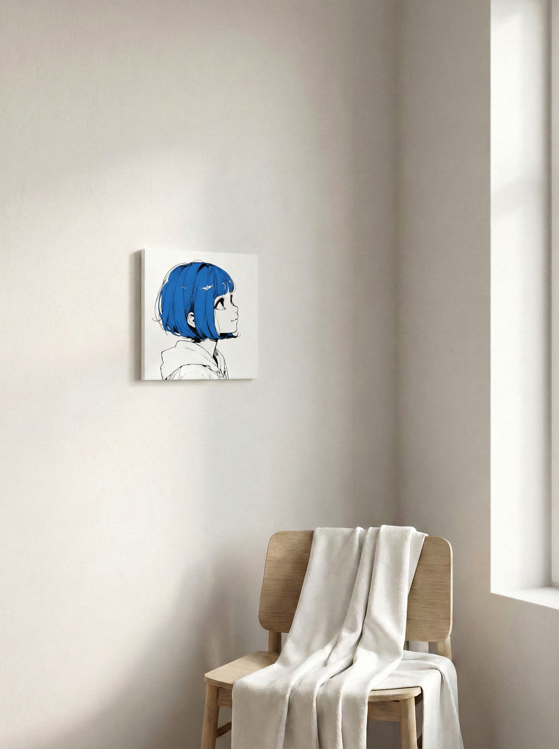 白壁のミニマルな空間や、北欧インテリアに合うやわらかな木家具のある部屋、整えられたデスク周りに特によくなじみます。シンプルな空間に飾ると、ブルーのアクセントがほどよい温度を添え、静かな中にも個性のある印象へと導いてくれます。主張しすぎず、それでいて視線を惹きつけるため、おしゃれな空間づくりに取り入れやすいアートです。