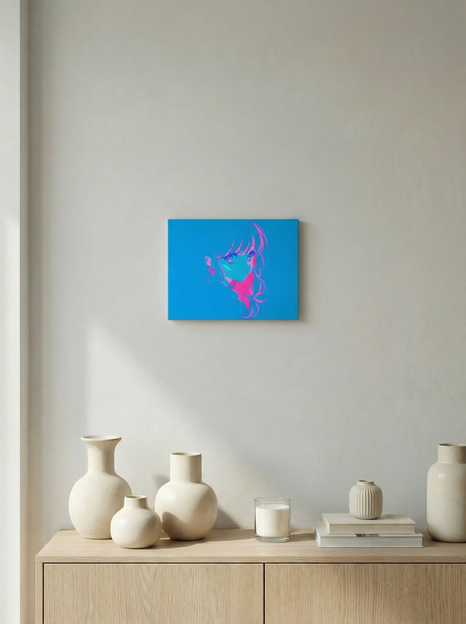 「ネオン・エッセンス」は、光と影の境界を極限まで抽象化した、極めてモダンなポートレートです。背景を大胆に排除し、鮮烈なシアンとビビッドなピンクの二色のみで描き出された少女のシルエットは、まるでデジタルな夢の中に溶け出していくような浮遊感を湛えています。