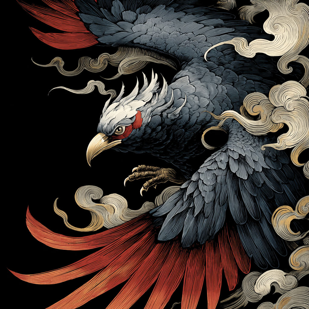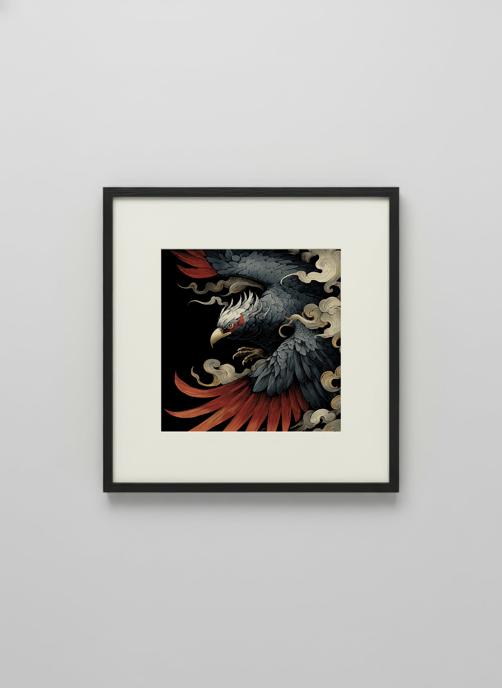 墨のような羽の重なりに、赤と金のアクセントが光り、重厚でありながらどこか幻想的な空気を漂わせています。羽ばたきに巻き上がる雲の流線が、神話的な世界への入口のようにも感じられ、まさに「空間のトーンを変えるアート」です。