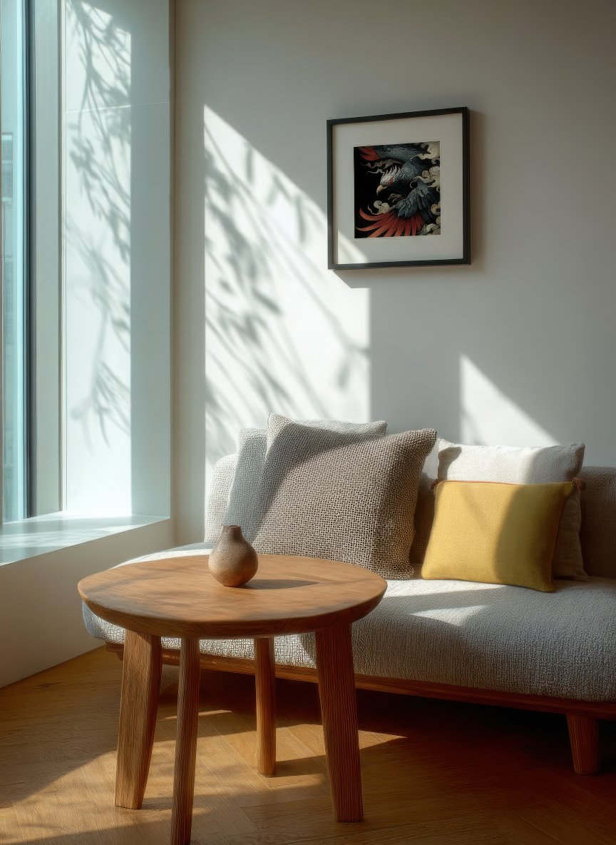 モノトーン基調のリビングや、静けさを求める書斎に。壁の一面にアクセントとして飾れば、空間が引き締まり、その場に込めた想いや審美眼が自然と伝わるインテリアに仕上がります。光の当たり方で羽や雲の質感が変化し、時間帯によって異なる表情を楽しめるのも魅力です。