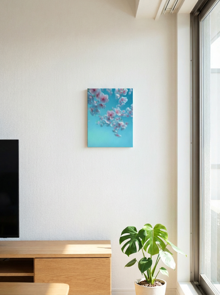 水色と薄紅色の繊細なコントラストが、空間全体に清々しさと華やかさをもたらします。眺めるたびに心がふわりと軽くなり、新しい季節の訪れや希望、そして日常の中にあるささやかな美しさを思い出させてくれる、優しさに満ちたアートです。