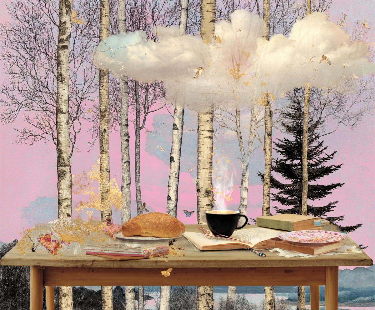 白樺の森の中、ピンクとブルーが混ざり合う空に浮かぶ雲。その下で広がるのは、本とパンと温かなコーヒーが並ぶ、小さな木のテーブル。
