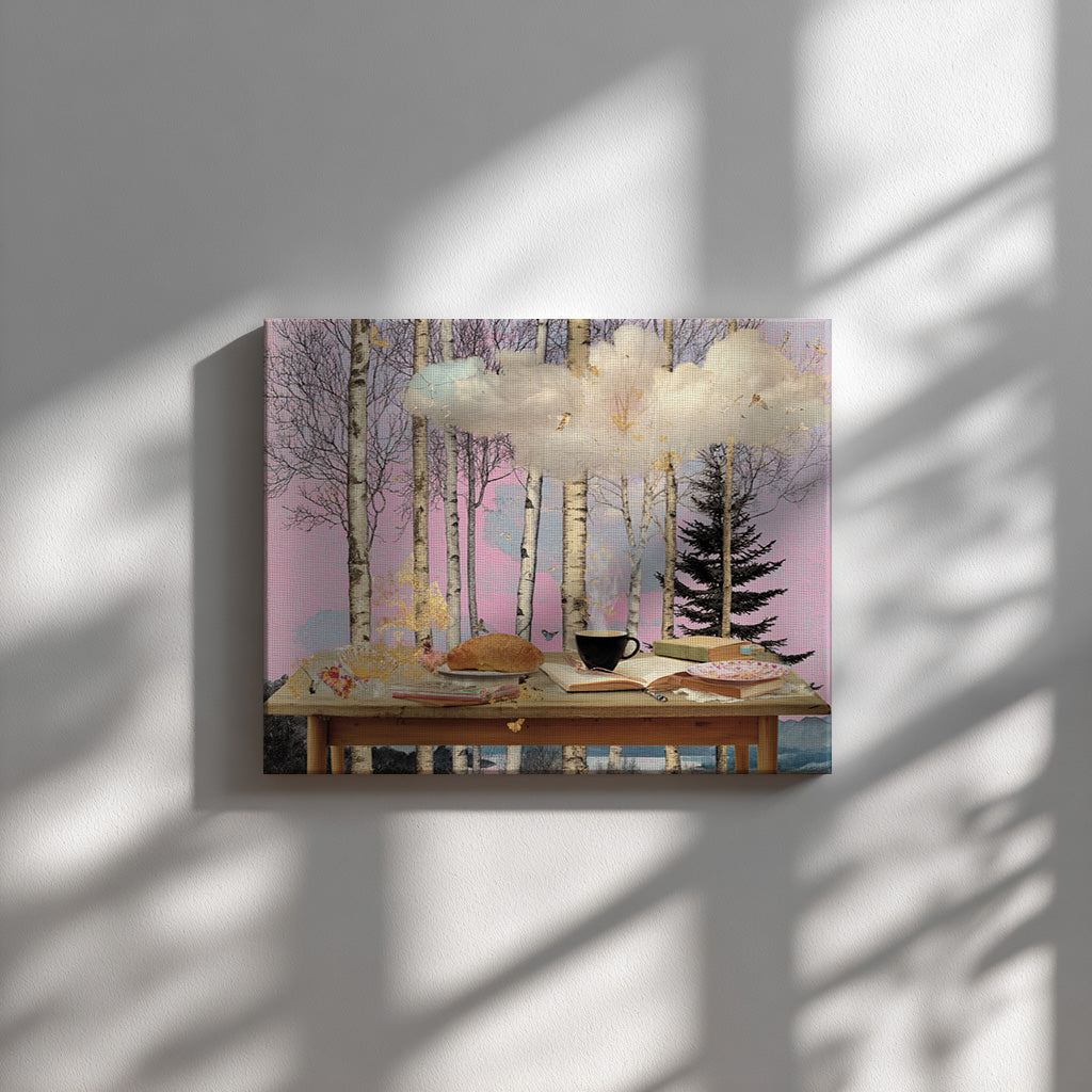 - 月森 灯は、白樺の森と朝の空を背景に、詩的な静物たちが佇む風景を描くアーティストです。まるで物語の始まりのような木製テーブルには、本やパン、コーヒーが静かに置かれ、誰かがいたはずの余韻だけが残されています。空は淡いピンクからラベンダーへと移ろい、木々のすき間からこぼれる光や浮かぶ雲が、現実と幻想のあいだにある柔らかな時間を演出しています。 絵本のように平面的でありながら、モチーフには質感があり、視覚的なあたたかさと静謐さが共存しています。作品には人物が描かれていないにもかかわらず、確かに「誰かの気配」が感じられ、それが見る人の記憶や感情をそっと揺らすのです。静かでやさしく、そして少しだけ不思議なその空間には、言葉にできない物語が流れており、観る人それぞれの想像力によって完成する余白が広がっています。 月森の作品は、日常と夢の境界線をふわりと越えて、「懐かしさの中にある新しさ」や、「孤独の中にあるぬくもり」を感じさせてくれるアートです。インテリアとしても空間にやわらかな空気を届け、見るたびに心を落ち着かせるような静かな魅力を持っています。