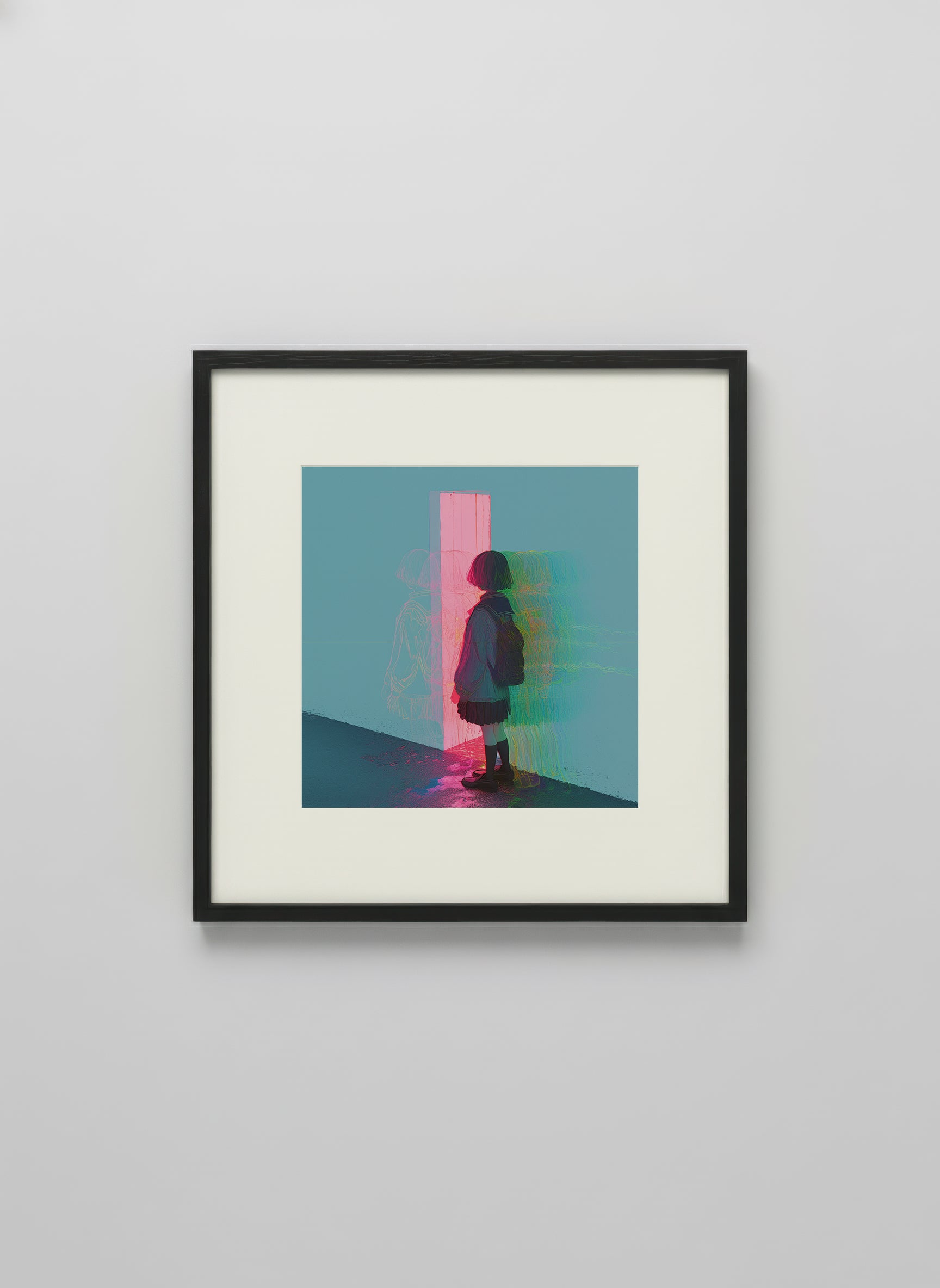 静かな壁面に差し込むような光と、淡いノイズがふっと溶け合うような空気をまとった一枚です。 青みを帯びた静寂のなかに、にじむピンクとグリーンの残像が揺れ、見る人の感覚にそっと触れる「空間アート」としての存在感があります。 言葉より先に、直感が反応するような静けさと余白が広がります。