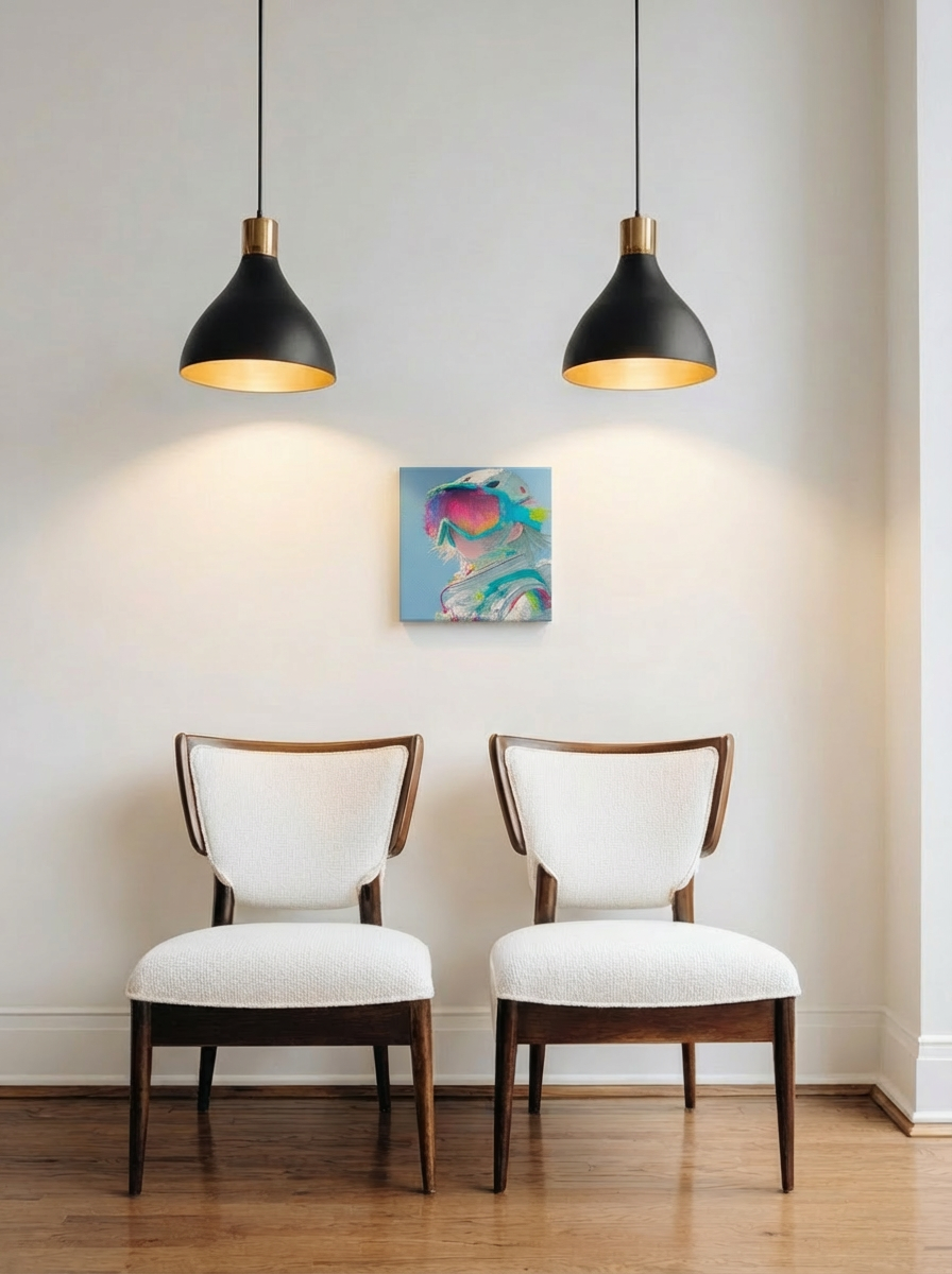 目線より少し高めに飾ることで、空へと抜けていくような爽やかな広がりを感じられます。 白やライトグレーのインテリアと相性が良く、ミニマルな空間に置くと作品の色の揺らぎがより美しく引き立ちます。 一つのフォーカルポイントとして飾れば、部屋全体の印象を静かで軽やかなトーンへと導いてくれます。
