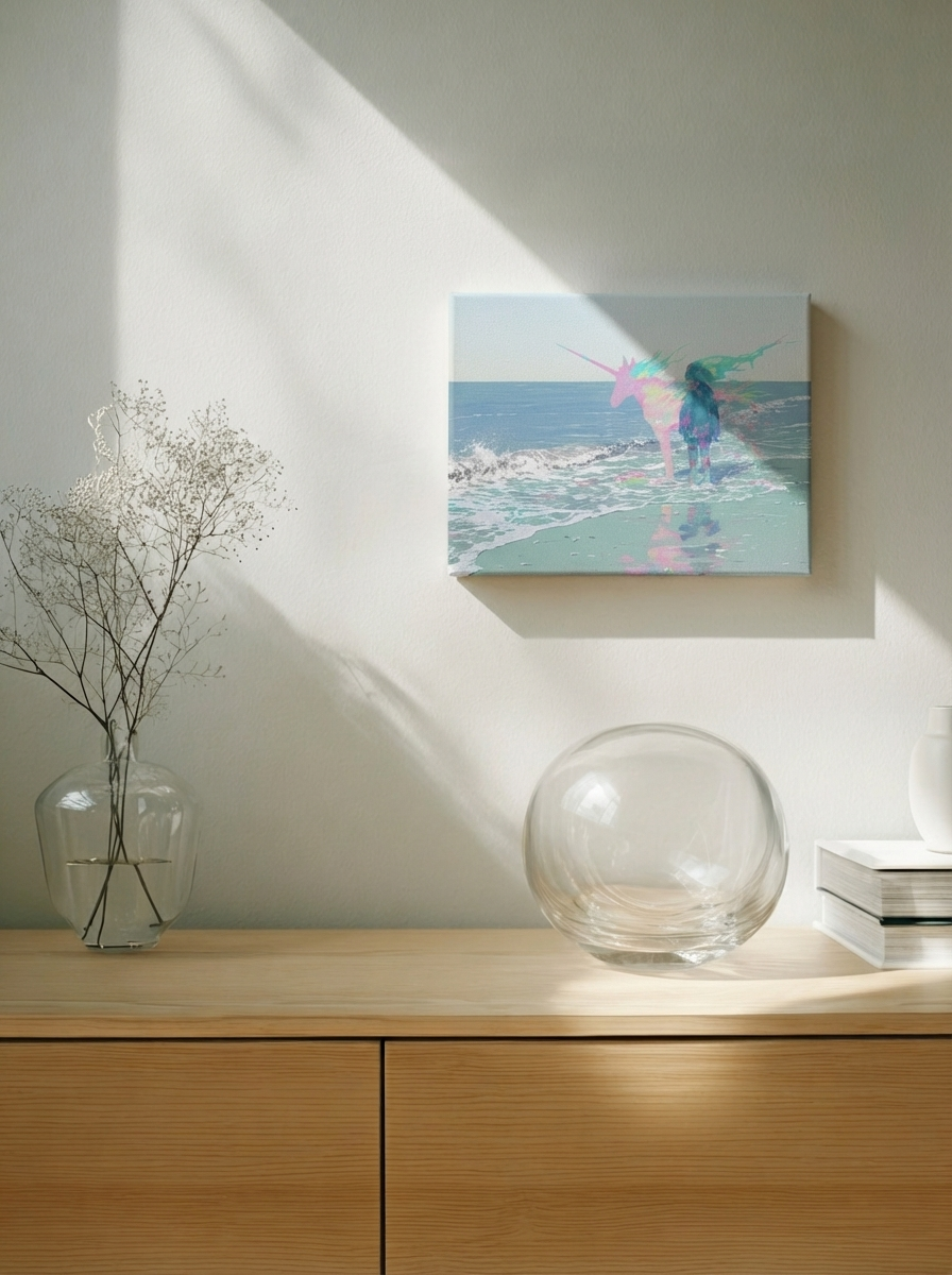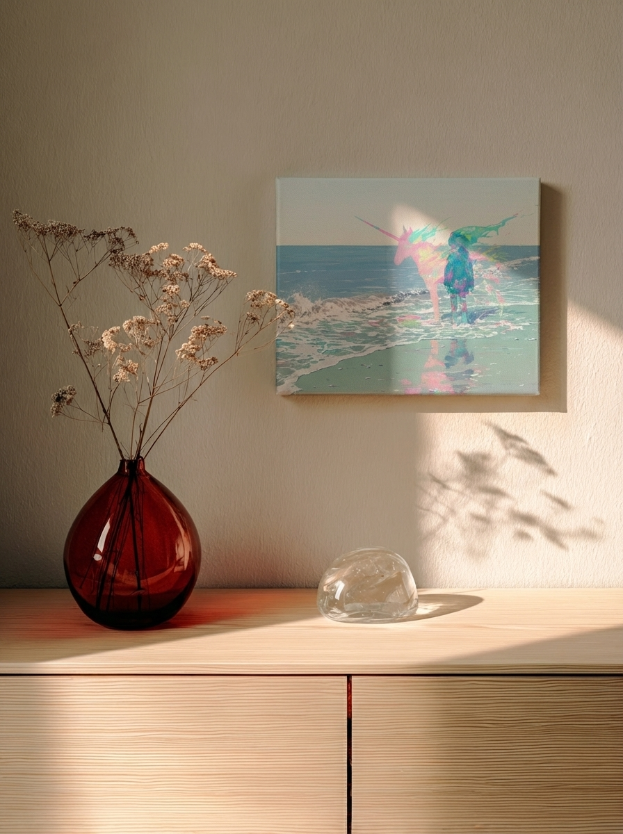 静かに続く水平線と、穏やかに寄せる波。その落ち着いた景色の中に、色彩の揺らぎが重なり、現実と幻想の境目がゆっくりと溶けていくような印象を与えます。淡いブルーを軸に、ピンクやグリーンがにじむように広がり、視線を自然と奥へと誘います。