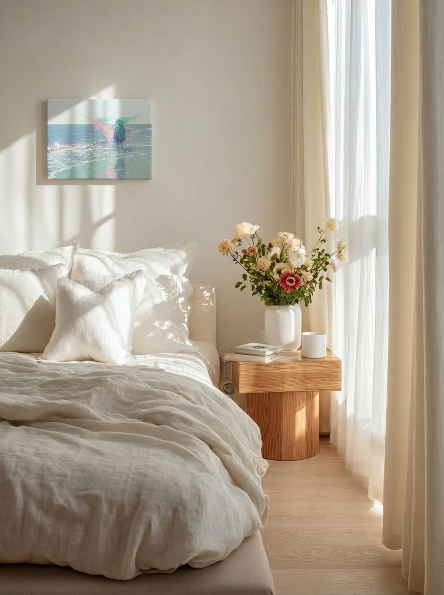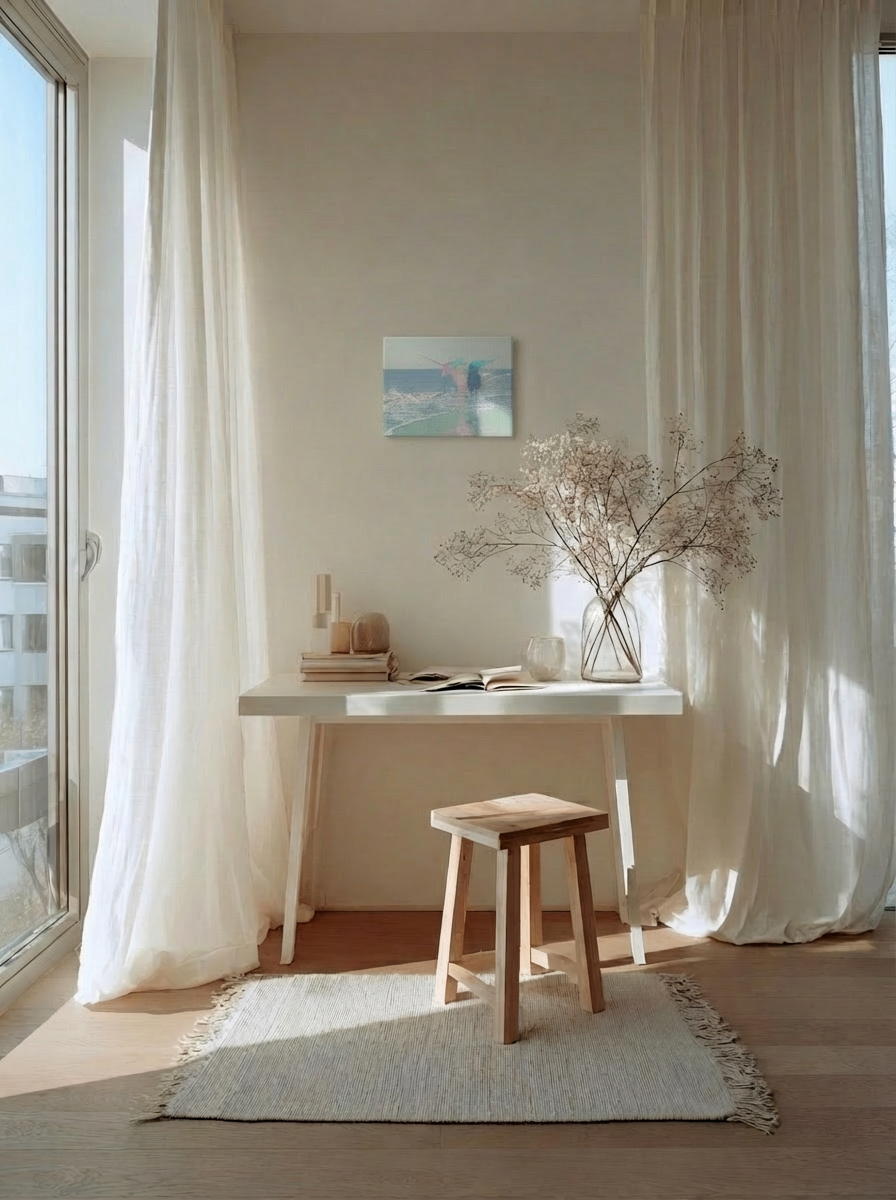 白や淡いグレーの壁を基調としたミニマルな空間や、静けさを大切にした北欧テイストのインテリアとよく調和します。空間に余白を持たせて飾ることで、部屋全体の空気がやわらぎ、日常の中に静かな余韻をもたらしてくれます。