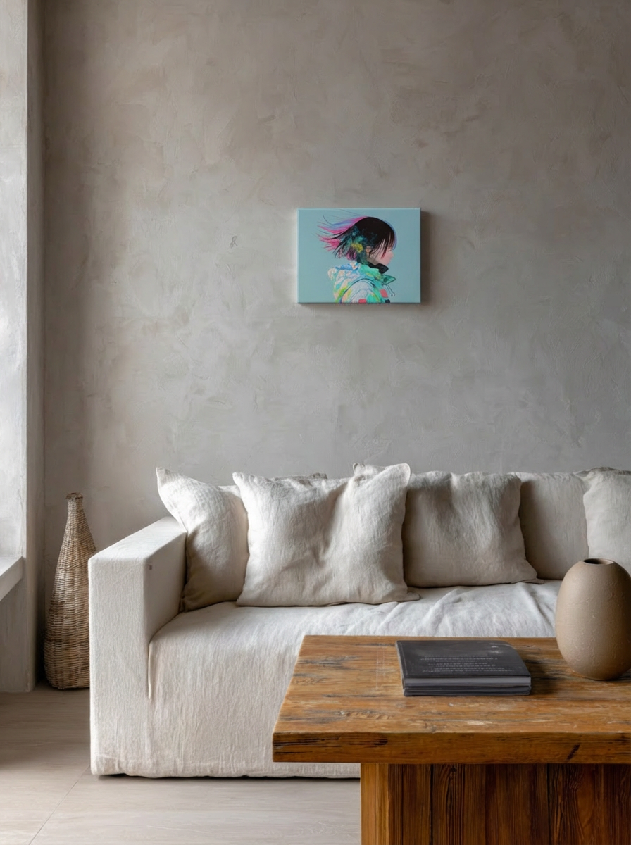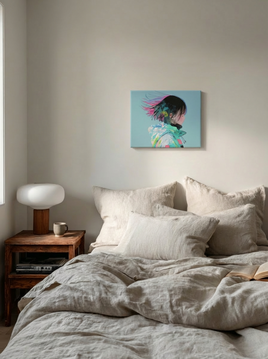 ミニマルな空間や、北欧テイストの明るい部屋によく馴染む一枚です。白や淡いグレーの壁に合わせることで色彩が引き立ち、空間に静かな奥行きをもたらします。リビングやワークスペースに取り入れることで、気持ちを整える穏やかなアクセントとして機能します。