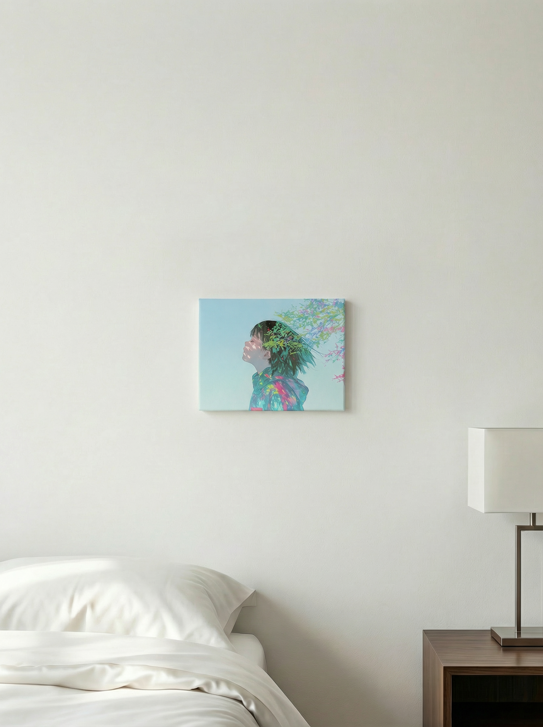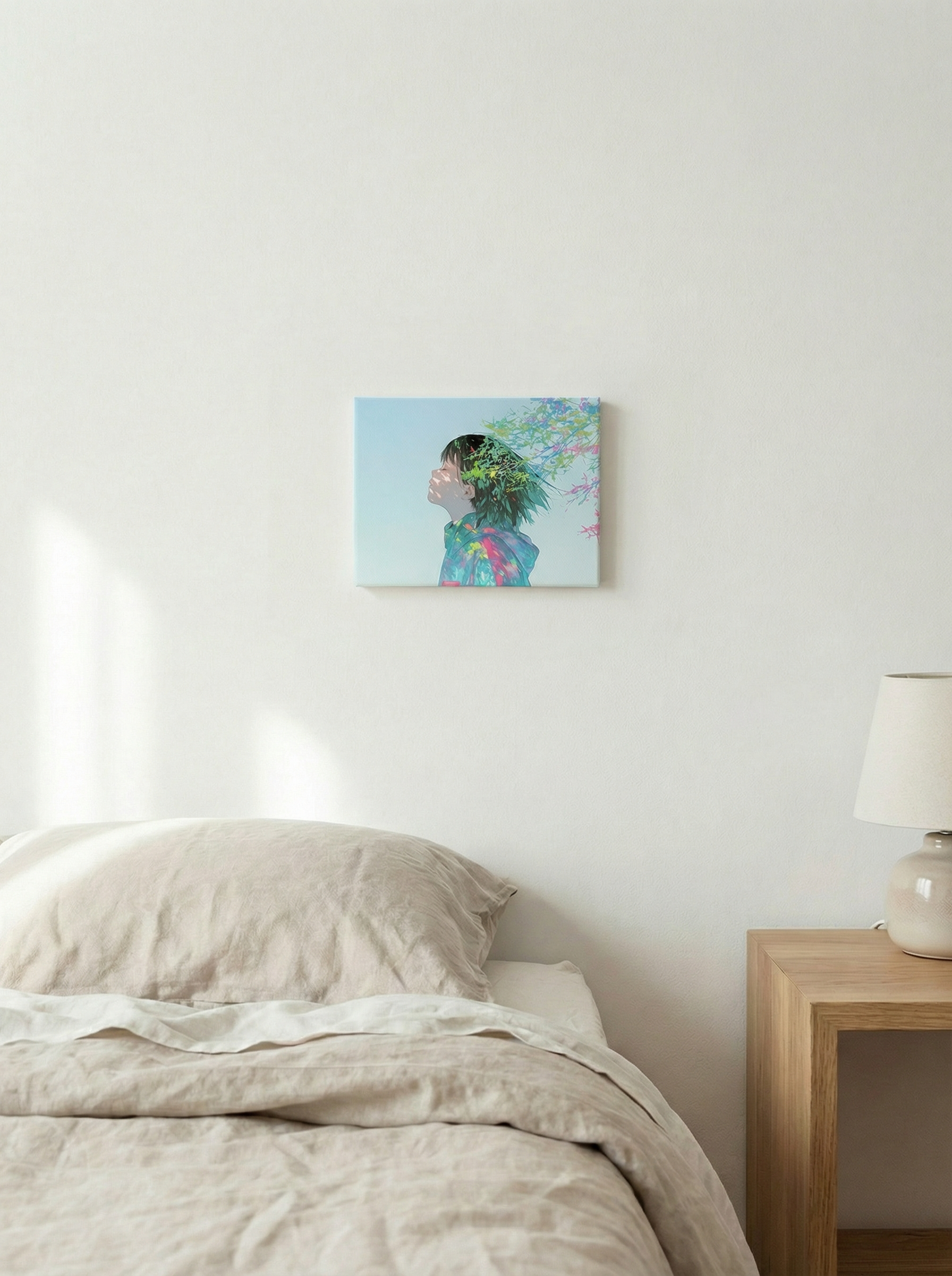 白壁のリビングやミニマルな寝室、整えられたデスクスペースにおすすめです。空間に静かな抜け感をつくりながら、鮮やかな色がさりげないアクセントとして機能します。主張しすぎず、それでいて確かな存在感を放ち、部屋全体の空気を澄ませるような一枚です。