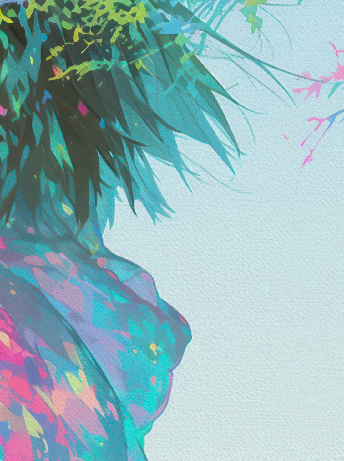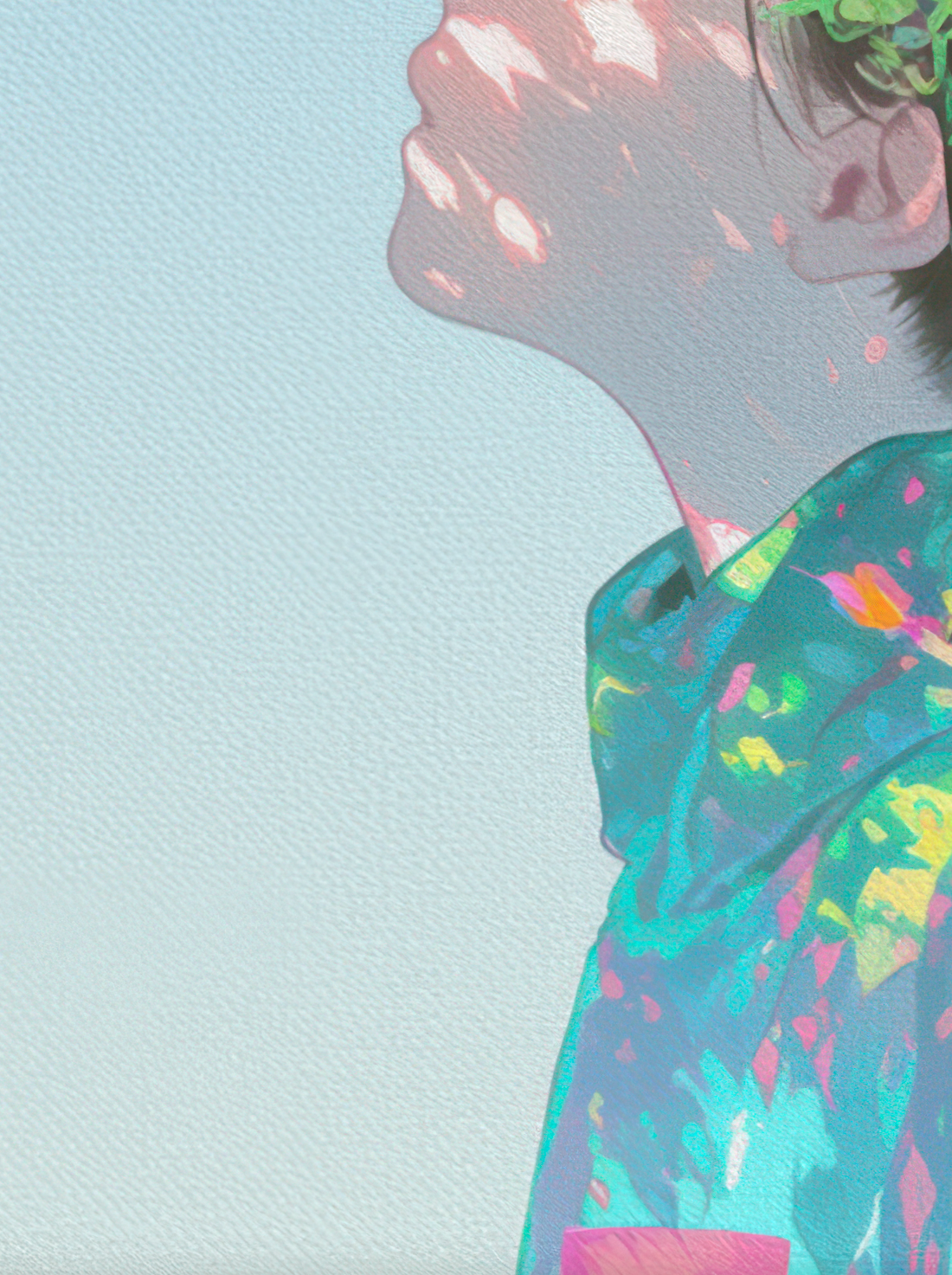 淡いブルーの背景に包まれた構図の中、やわらかな光とともに広がる色彩が印象的な一枚。ターコイズやピンク、イエローの鮮やかな色が軽やかに重なり合い、透明感のあるレイヤーを形成しています。静かな余白と躍動する色の対比が、画面全体に心地よい緊張感を生み出しています。